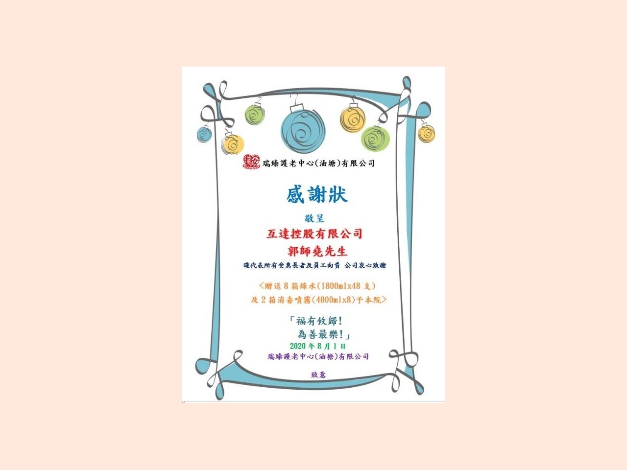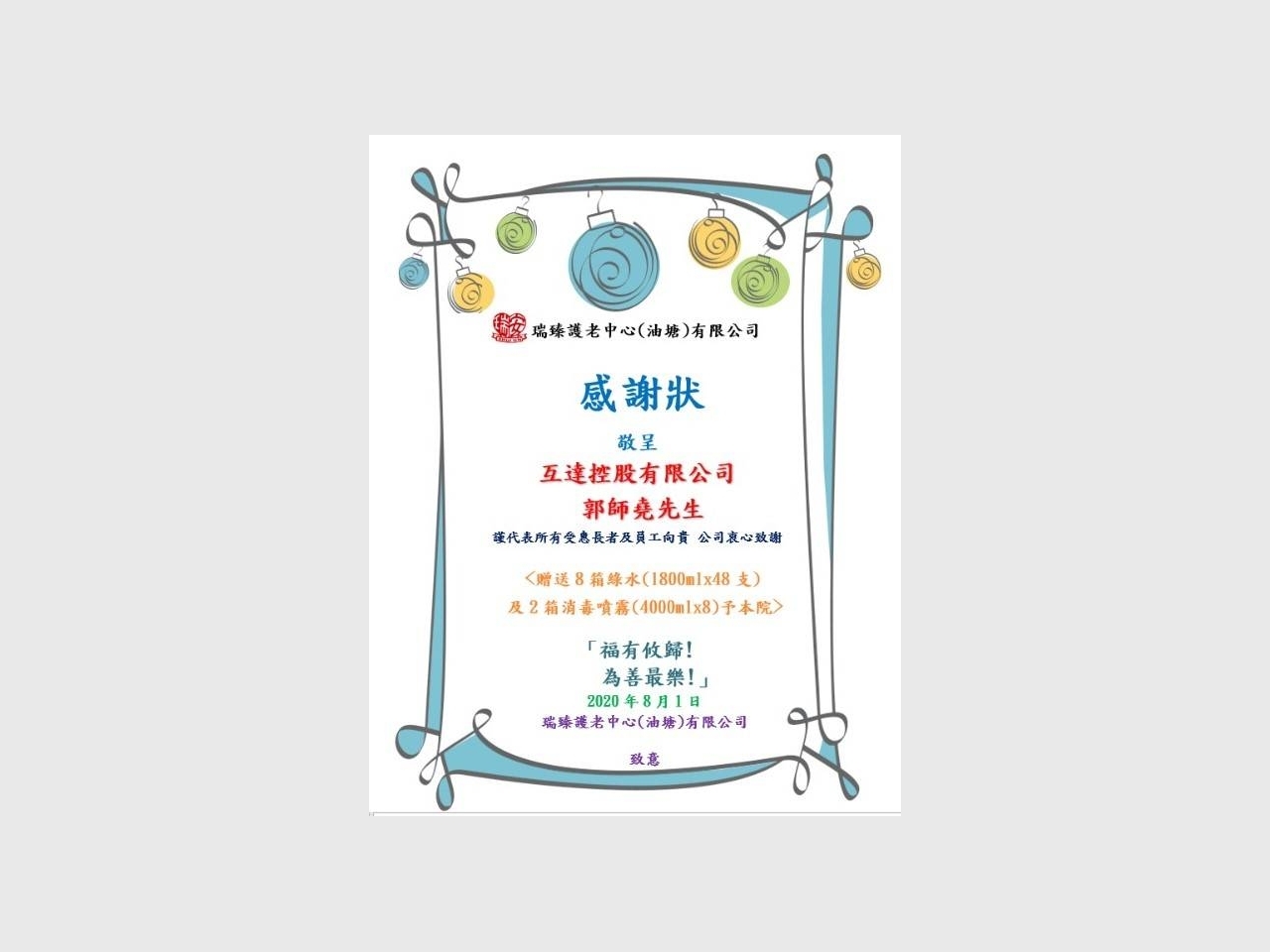感謝!透過"互達控股有限公司" 郭師堯先生贈送8箱綠水(1800ML X 48支)及2箱消毒噴霧(4000ML X 8)予本院!為各長者及護理人員提供保護!「福有攸歸! 為善最樂!」